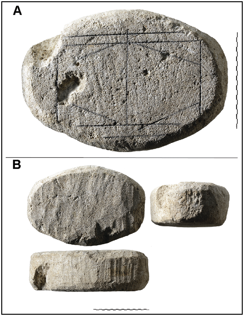 Objeto 04433 en el Museo Het Romeins, Heerlen, Países Bajos: A) superficie superior, antes de la limpieza, con marcas de lápiz que describen las líneas incisadas; B) la parte inferior y los lados del objeto muestran un modelado intencional. Cada escala es de 100 mm (fotografías cortesía de Restaura).