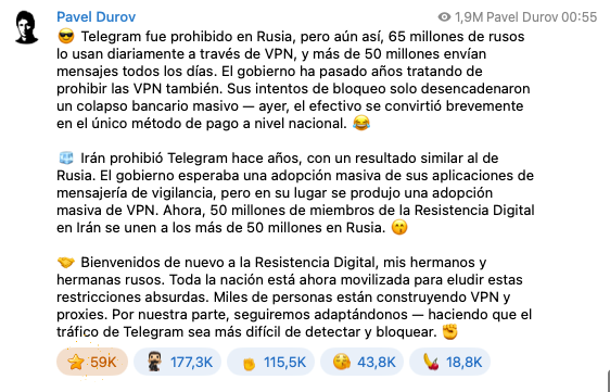 El empresario comparó la situación rusa con el antecedente de Irán, donde, según dijo, los bloqueos también terminaron impulsando la adopción masiva de VPN y servidores proxy. En ese contexto, prometió que Telegram seguirá adaptando su tráfico para dificultar la detección y el bloqueo por parte de los sistemas de control rusos.